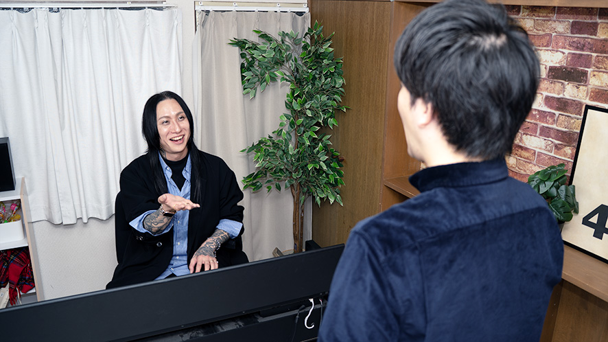 現状の発声、骨格や身体の歪み等を見ながら、一人ひとりにあった発声を見つけ出します。バンドマンとしての長いステージ歴やレコーディング経験から、歌唱のニュアンス面での細かい指導も得意としています。